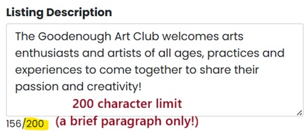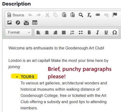 - Please provide a brief paragraph of text in the Listing (Short) Description which succinctly describes your club or society, and gives members a reason to join.